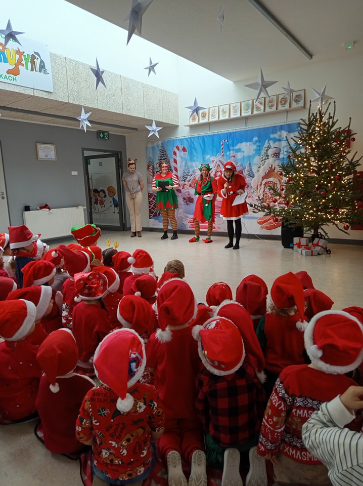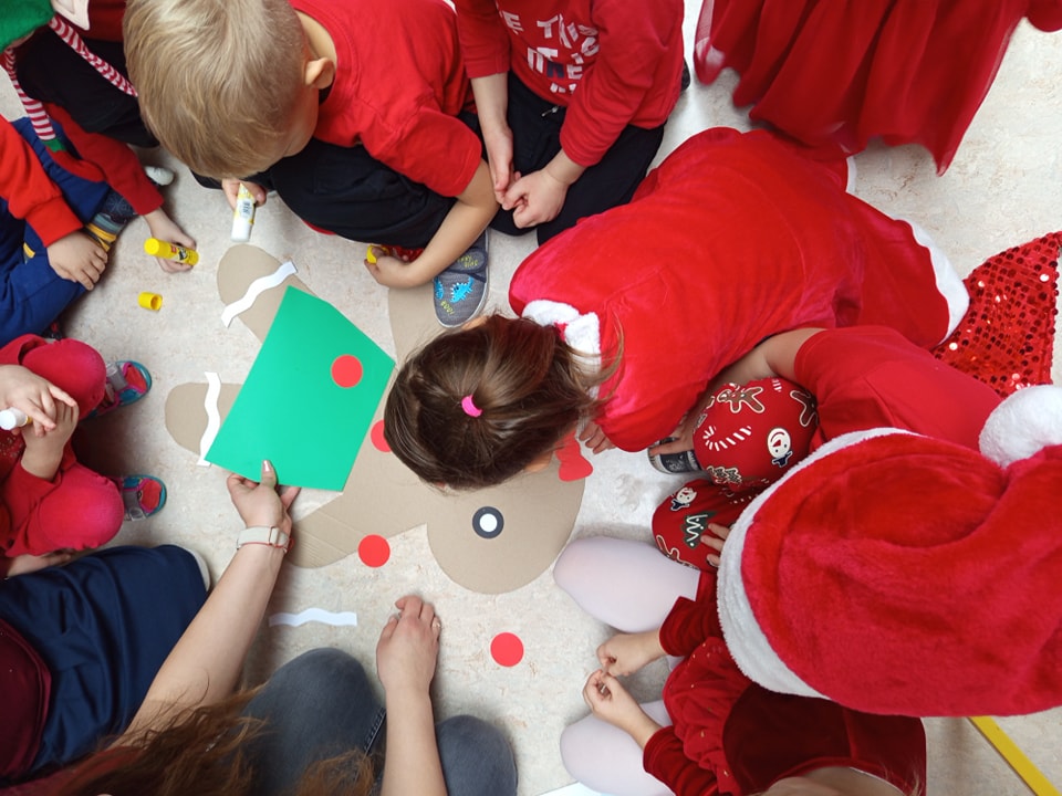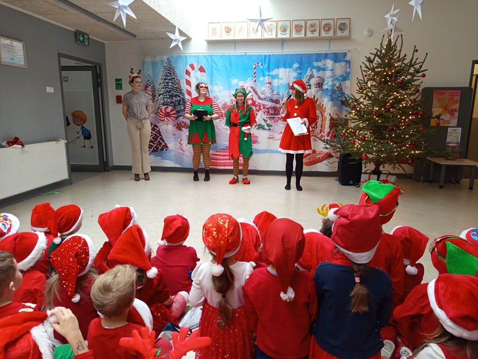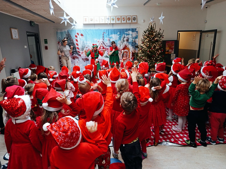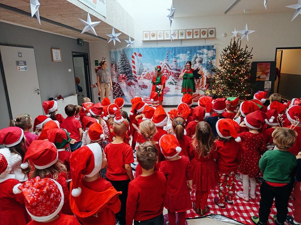 Spotkanie poprzedził krótki spektakl przygotowany przez naszych Elfów i reniferka. Przedszkolaki zostały mianowane małymi pomocnikami Elfów i wspólnie uczestniczyły w poszukiwaniu zaginionego prezentu, wykonując przy tym różnorodne zadania edukacyjno-zabawowe.