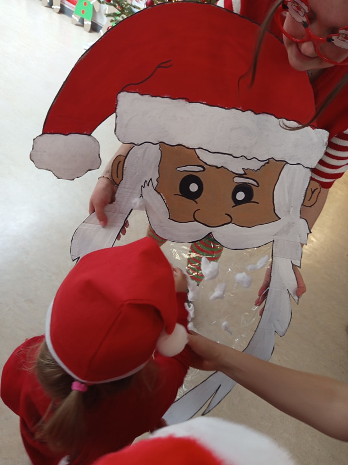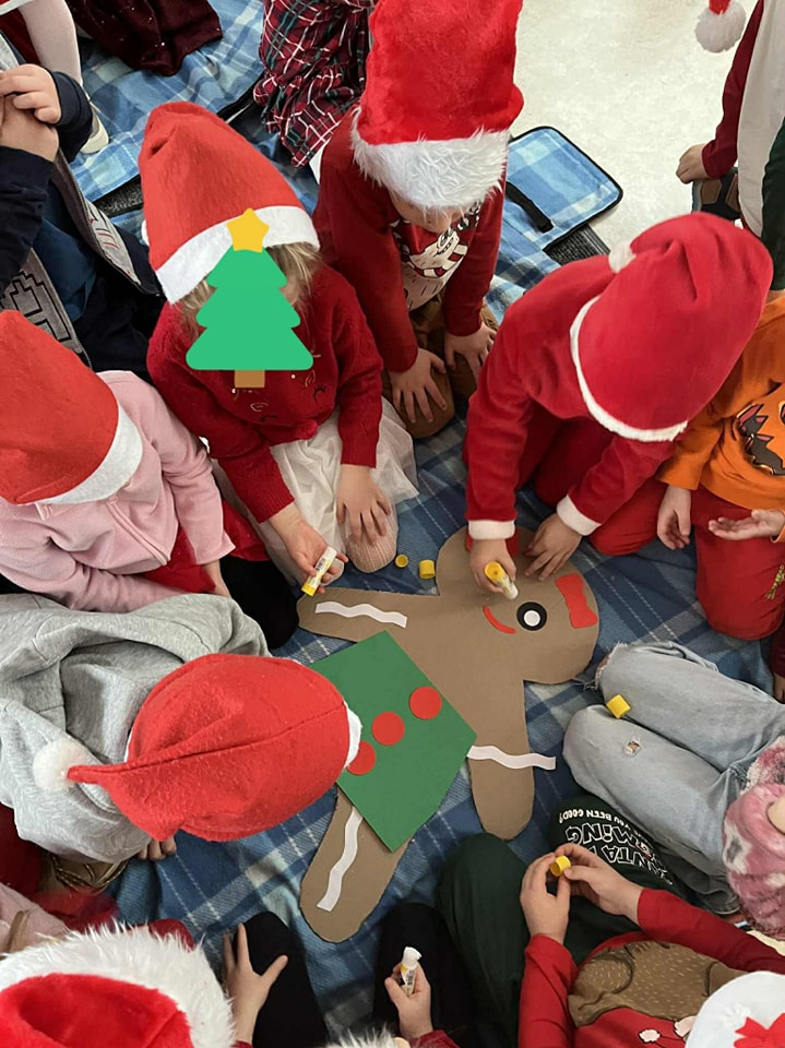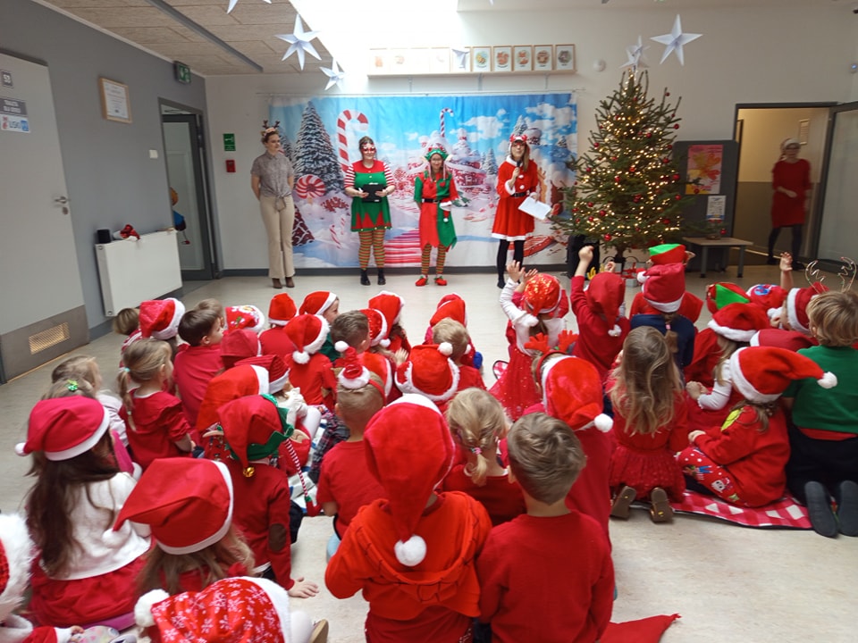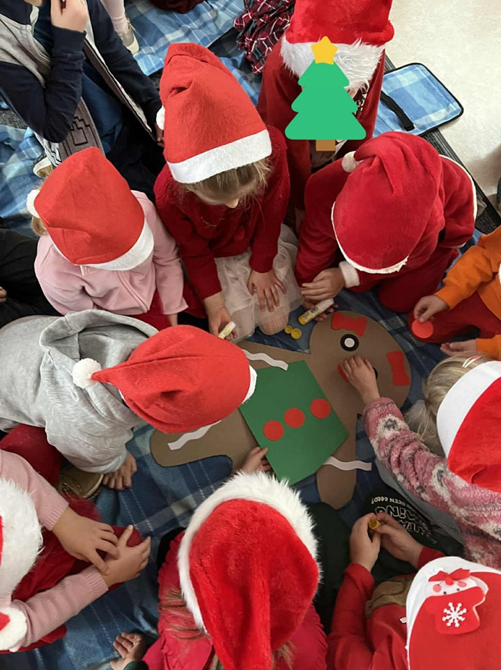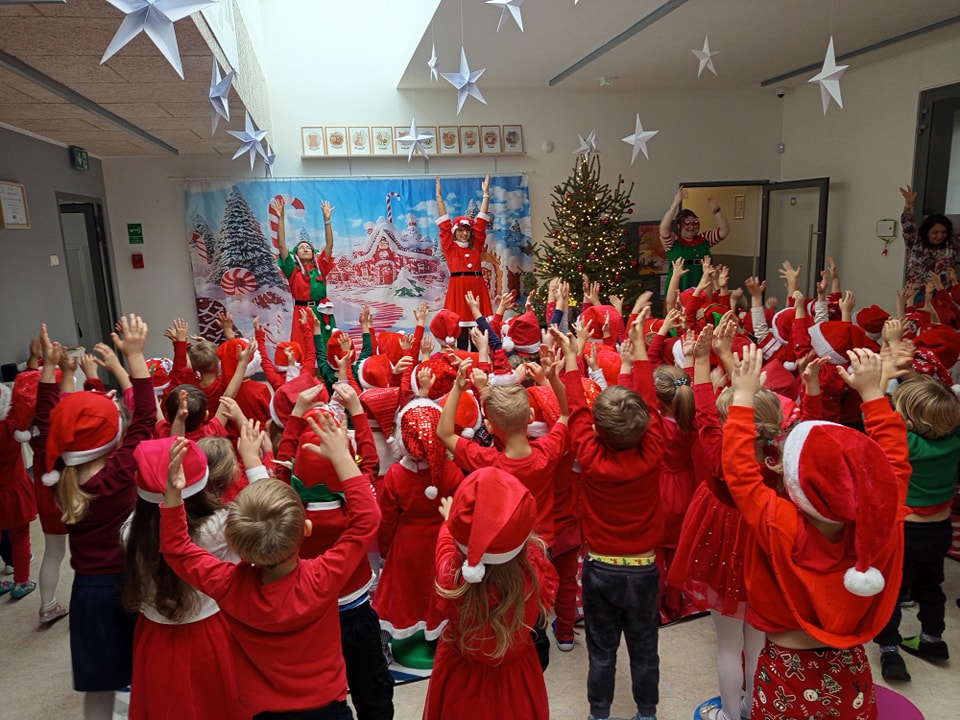 Spotkanie poprzedził krótki spektakl przygotowany przez naszych Elfów i reniferka. Przedszkolaki zostały mianowane małymi pomocnikami Elfów i wspólnie uczestniczyły w poszukiwaniu zaginionego prezentu, wykonując przy tym różnorodne zadania edukacyjno-zabawowe.
