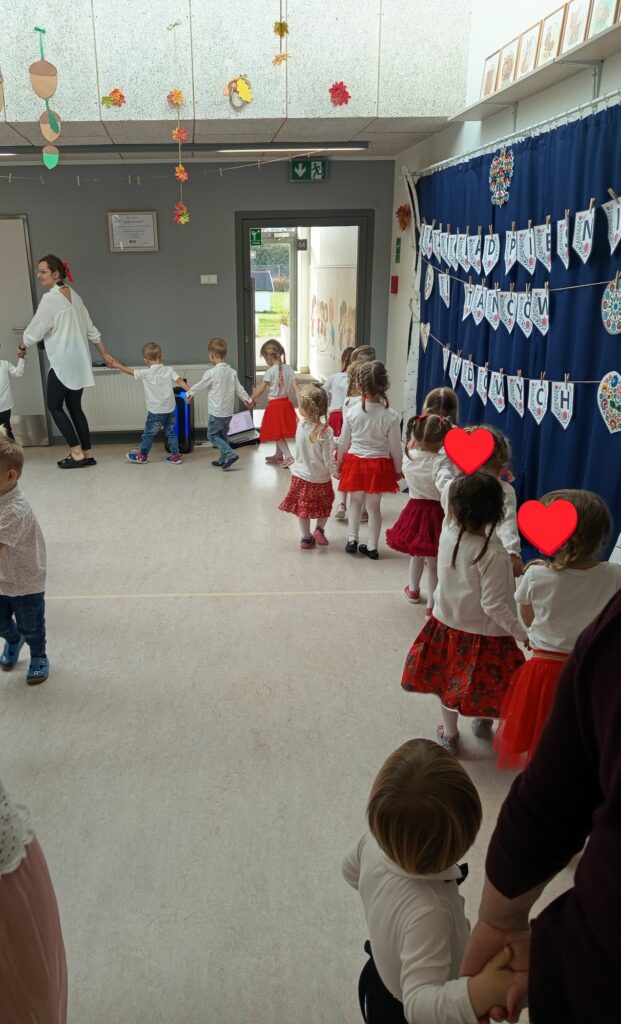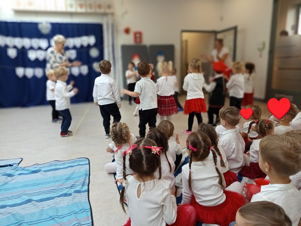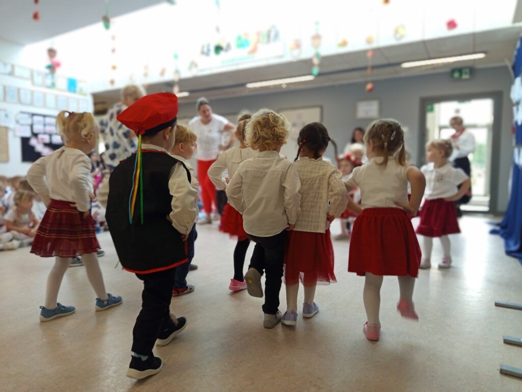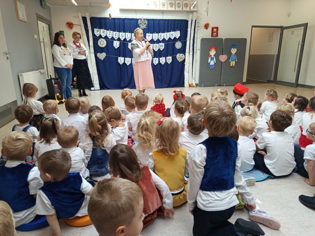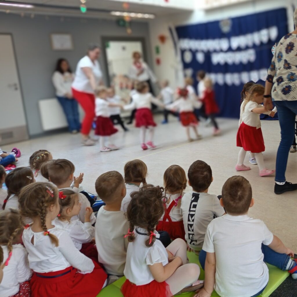 Już od pierwszych chwil sala wypełniła się kolorami ludowych strojów, radością dzieci oraz dźwiękami melodii z różnych zakątków kraju. Przedszkolaki zaprezentowały się wspaniale — z zaangażowaniem, energią i prawdziwą dumą z polskiej kultury.