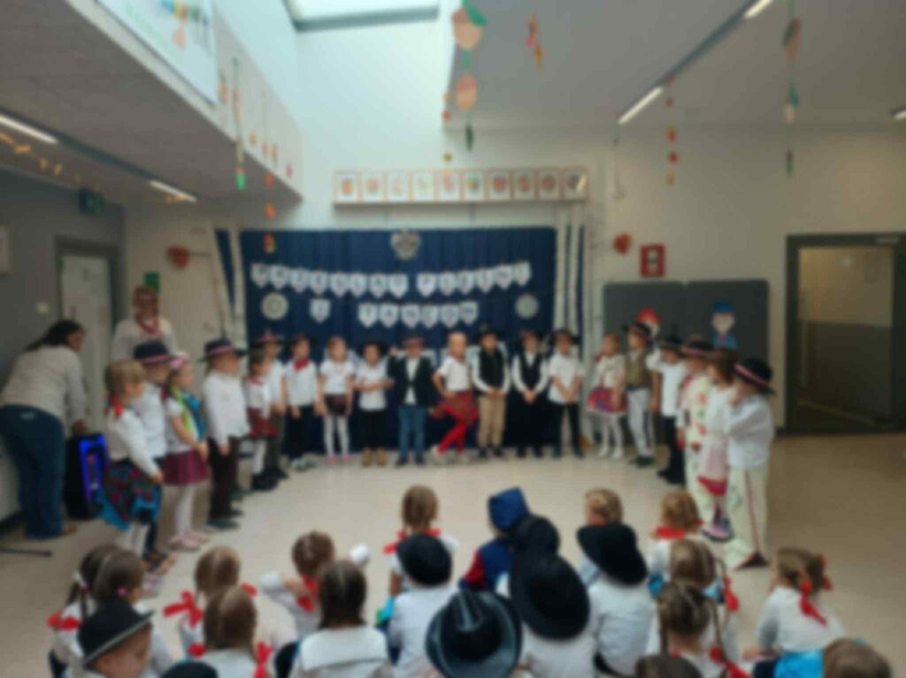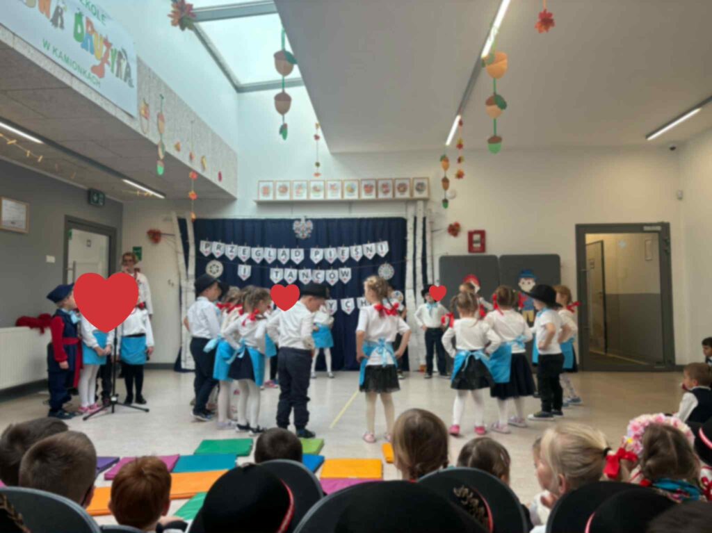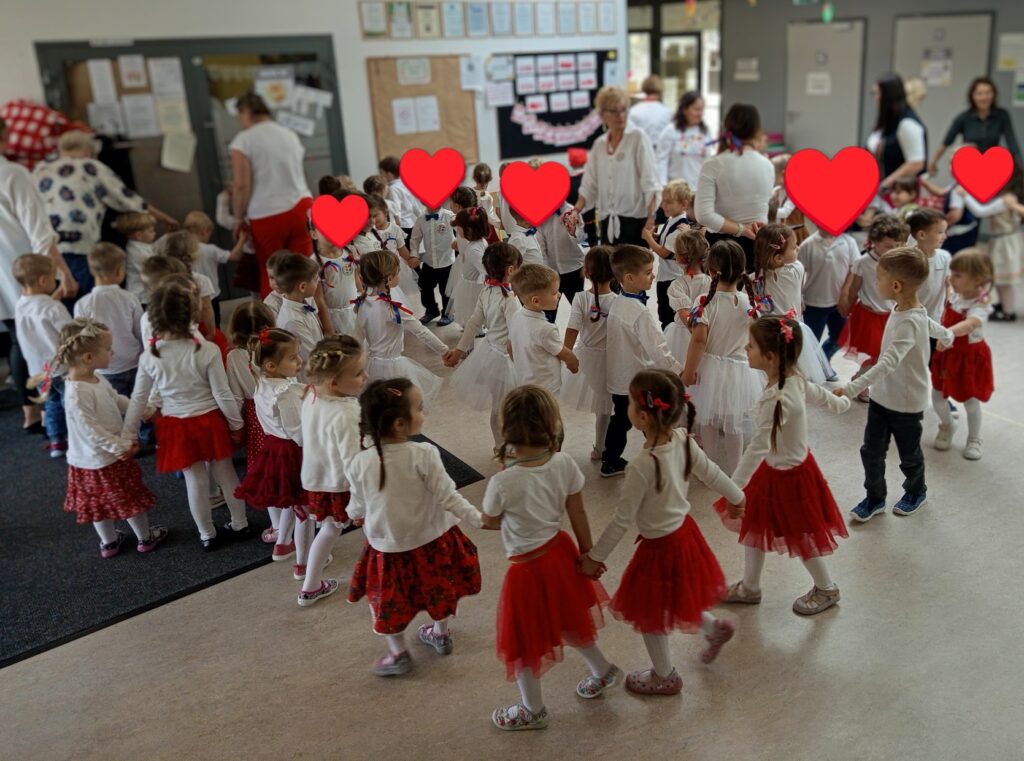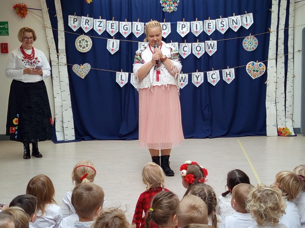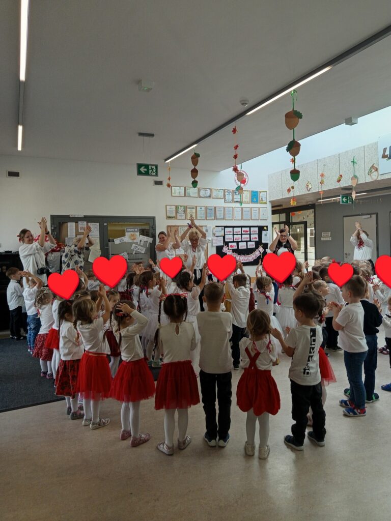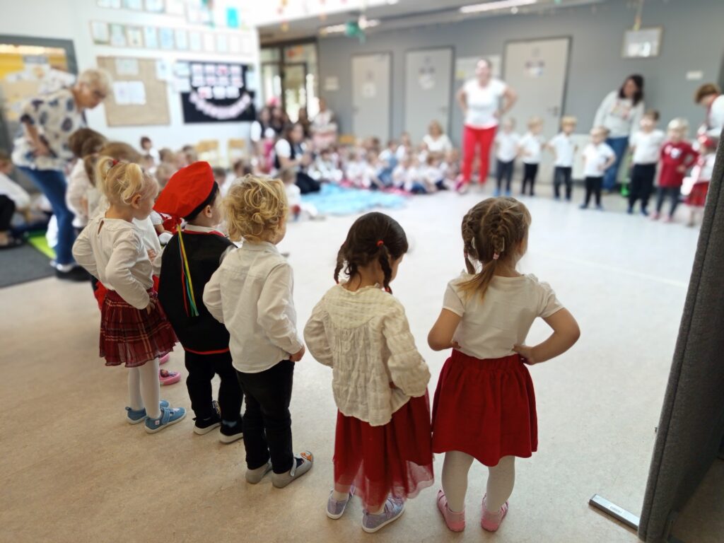 Już od pierwszych chwil sala wypełniła się kolorami ludowych strojów, radością dzieci oraz dźwiękami melodii z różnych zakątków kraju. Przedszkolaki zaprezentowały się wspaniale — z zaangażowaniem, energią i prawdziwą dumą z polskiej kultury.